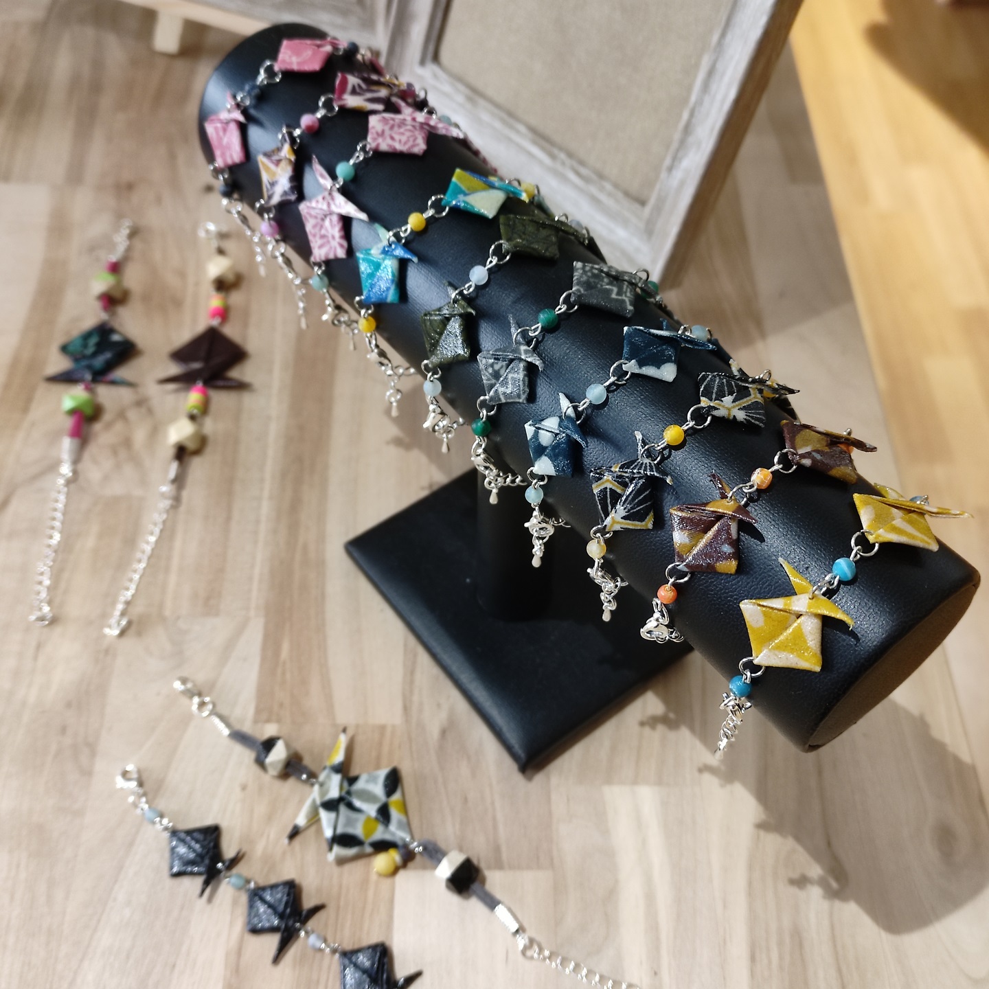 Venez découvrir notre gamme de bijoux éco-responsables réalisés à partir de nos chutes de tissus. La Tisseuse de Lunes, c’est la valorisation de nos plus petits bouts de tissus en de magnifiques bijoux origami agrémentés de perles d’agate givrée et de jolies perles en bois. Avec notre technique unique, nos origamis sont réalisés en tissu, sans couture. Ils résistent donc à l’humidité et ne se déchirent pas contrairement au papier.